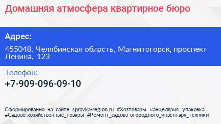 Домашняя атмосфера, квартирное бюро по адресу 455048, Челябинская область, Магнитогорск, проспект Ленина, 123 в дальнейшем Организация, размещена в следующих категориях: