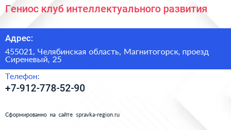 Гениос, клуб интеллектуального развития по адресу 455021, Челябинская область, Магнитогорск, проезд Сиреневый, 25 в дальнейшем Организация, размещена в следующих категориях: