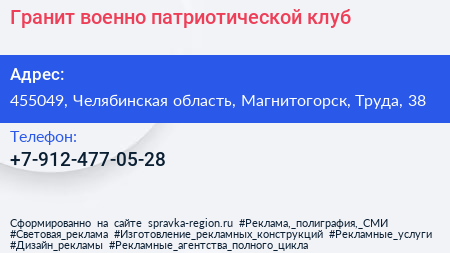 Гранит, военно-патриотической клуб по адресу 455049, Челябинская область, Магнитогорск, Труда, 38 в дальнейшем Организация, размещена в следующих категориях: