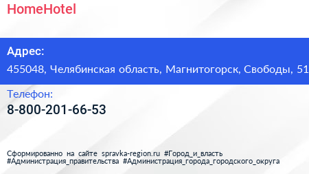 HomeHotel по адресу 455048, Челябинская область, Магнитогорск, Свободы, 51 в дальнейшем Организация, размещена в следующих категориях: