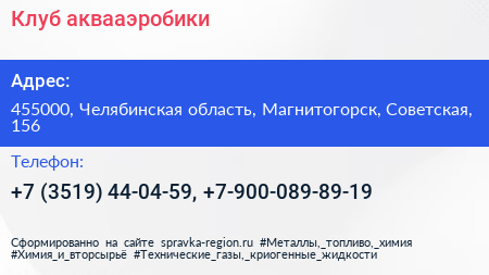 Клуб аквааэробики по адресу 455000, Челябинская область, Магнитогорск, Советская, 156 в дальнейшем Организация, размещена в следующих категориях: