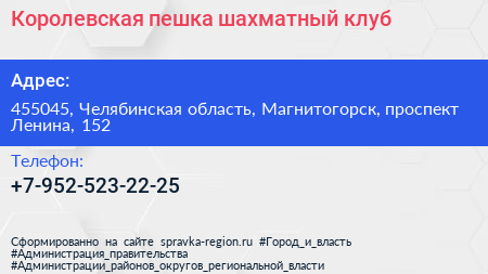 Королевская пешка, шахматный клуб по адресу 455045, Челябинская область, Магнитогорск, проспект Ленина, 152 в дальнейшем Организация, размещена в следующих категориях: