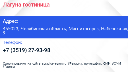 Лагуна, гостиница по адресу 455023, Челябинская область, Магнитогорск, Набережная, 9 в дальнейшем Организация, размещена в следующих категориях: