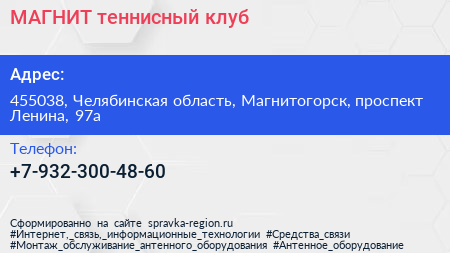 МАГНИТ, теннисный клуб по адресу 455038, Челябинская область, Магнитогорск, проспект Ленина, 97а в дальнейшем Организация, размещена в следующих категориях: