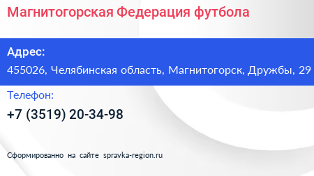 Магнитогорская Федерация футбола по адресу 455026, Челябинская область, Магнитогорск, Дружбы, 29 в дальнейшем Организация, размещена в следующих категориях: