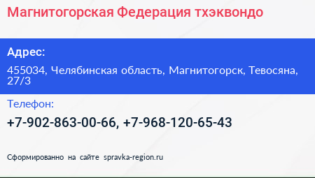 Магнитогорская Федерация тхэквондо по адресу 455034, Челябинская область, Магнитогорск, Тевосяна, 27/3 в дальнейшем Организация, размещена в следующих категориях: