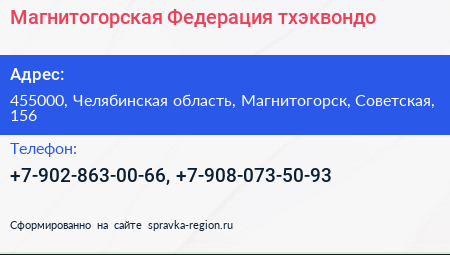 Магнитогорская Федерация тхэквондо по адресу 455000, Челябинская область, Магнитогорск, Советская, 156 в дальнейшем Организация, размещена в следующих категориях:
