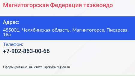 Магнитогорская Федерация тхэквондо по адресу 455001, Челябинская область, Магнитогорск, Писарева, 18а в дальнейшем Организация, размещена в следующих категориях: