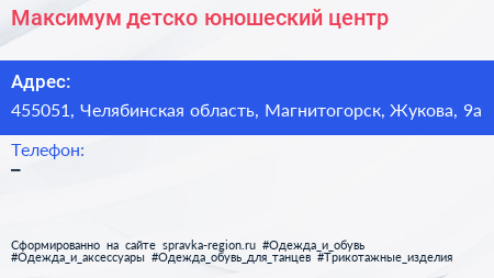 Максимум, детско-юношеский центр по адресу 455051, Челябинская область, Магнитогорск, Жукова, 9а в дальнейшем Организация, размещена в следующих категориях: