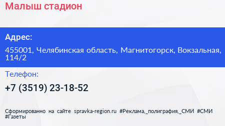 Малыш, стадион по адресу 455001, Челябинская область, Магнитогорск, Вокзальная, 114/2 в дальнейшем Организация, размещена в следующих категориях: