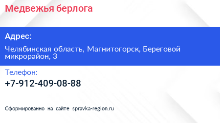 Медвежья берлога по адресу Челябинская область, Магнитогорск, Береговой микрорайон, 3 в дальнейшем Организация, размещена в следующих категориях: