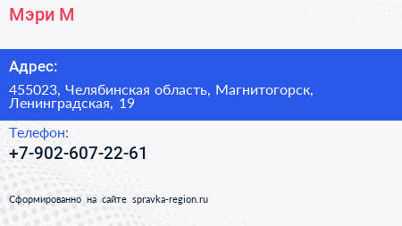 Мэри М по адресу 455023, Челябинская область, Магнитогорск, Ленинградская, 19 в дальнейшем Организация, размещена в следующих категориях: