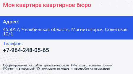 Моя квартира, квартирное бюро по адресу 455017, Челябинская область, Магнитогорск, Советская, 10/1 в дальнейшем Организация, размещена в следующих категориях: