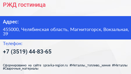 РЖД, гостиница по адресу 455000, Челябинская область, Магнитогорск, Вокзальная, 39 в дальнейшем Организация, размещена в следующих категориях: