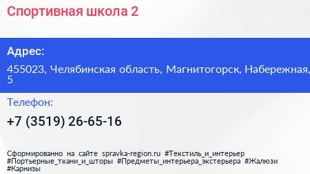 Спортивная школа №2 по адресу 455023, Челябинская область, Магнитогорск, Набережная, 5 в дальнейшем Организация, размещена в следующих категориях: