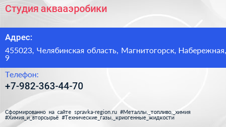 Студия аквааэробики по адресу 455023, Челябинская область, Магнитогорск, Набережная, 9 в дальнейшем Организация, размещена в следующих категориях: