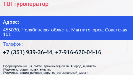TUI, туроператор по адресу 455030, Челябинская область, Магнитогорск, Советская, 161 в дальнейшем Организация, размещена в следующих категориях: