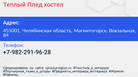 Теплый-Плед, хостел по адресу 455001, Челябинская область, Магнитогорск, Вокзальная, 84 в дальнейшем Организация, размещена в следующих категориях: