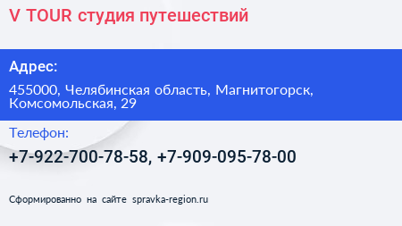 V TOUR, студия путешествий по адресу 455000, Челябинская область, Магнитогорск, Комсомольская, 29 в дальнейшем Организация, размещена в следующих категориях: