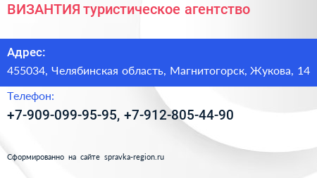 ВИЗАНТИЯ, туристическое агентство по адресу 455034, Челябинская область, Магнитогорск, Жукова, 14 в дальнейшем Организация, размещена в следующих категориях: