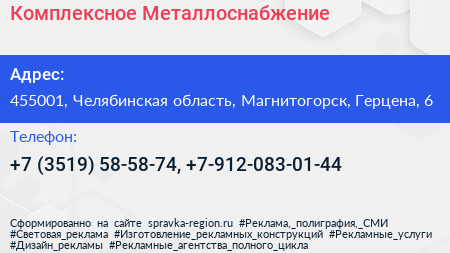 Комплексное Металлоснабжение по адресу 455001, Челябинская область, Магнитогорск, Герцена, 6 в дальнейшем Организация, размещена в следующих категориях: