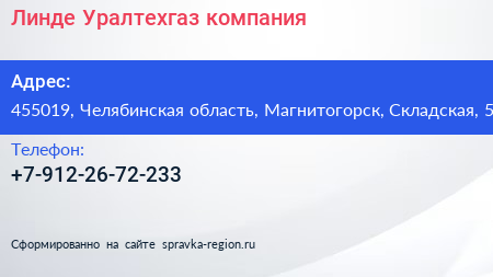 Линде Уралтехгаз, компания по адресу 455019, Челябинская область, Магнитогорск, Складская, 5 в дальнейшем Организация, размещена в следующих категориях: