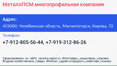 МеталлПСМ, многопрофильная компания по адресу 455000, Челябинская область, Магнитогорск, Кирова, 72 в дальнейшем Организация, размещена в следующих категориях:
