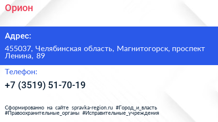 Орион по адресу 455037, Челябинская область, Магнитогорск, проспект Ленина, 89 в дальнейшем Организация, размещена в следующих категориях: