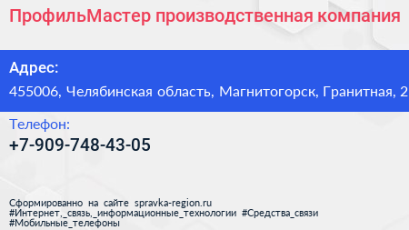 ПрофильМастер, производственная компания по адресу 455006, Челябинская область, Магнитогорск, Гранитная, 2 в дальнейшем Организация, размещена в следующих категориях: