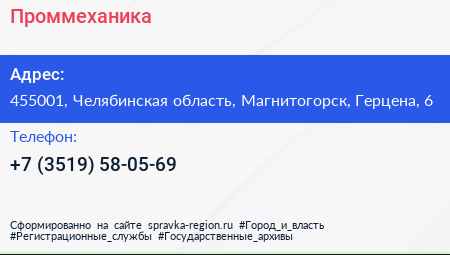 Проммеханика по адресу 455001, Челябинская область, Магнитогорск, Герцена, 6 в дальнейшем Организация, размещена в следующих категориях: