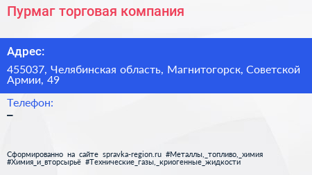 Пурмаг, торговая компания по адресу 455037, Челябинская область, Магнитогорск, Советской Армии, 49 в дальнейшем Организация, размещена в следующих категориях:
