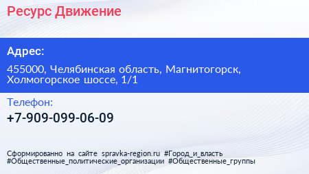 Ресурс Движение по адресу 455000, Челябинская область, Магнитогорск, Холмогорское шоссе, 1/1 в дальнейшем Организация, размещена в следующих категориях: