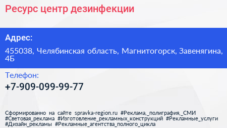 Ресурс, центр дезинфекции по адресу 455038, Челябинская область, Магнитогорск, Завенягина, 4Б в дальнейшем Организация, размещена в следующих категориях: