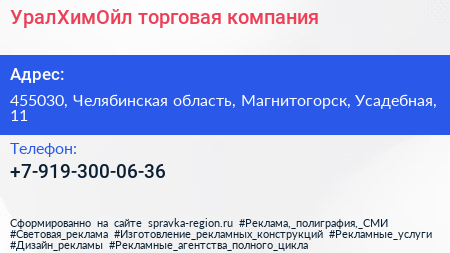 УралХимОйл, торговая компания по адресу 455030, Челябинская область, Магнитогорск, Усадебная, 11 в дальнейшем Организация, размещена в следующих категориях: