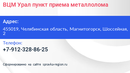 ВЦМ Урал, пункт приема металлолома по адресу 455019, Челябинская область, Магнитогорск, Шоссейная, 2 в дальнейшем Организация, размещена в следующих категориях: