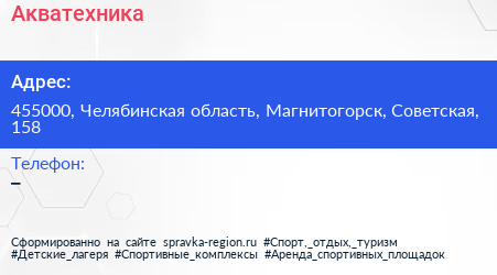 Акватехника по адресу 455000, Челябинская область, Магнитогорск, Советская, 158 в дальнейшем Организация, размещена в следующих категориях: