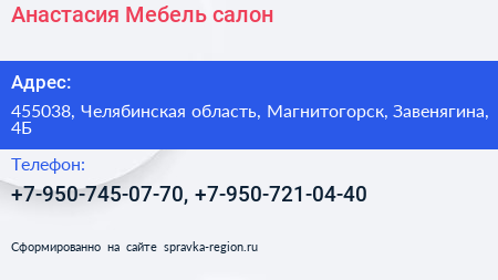 Анастасия-Мебель, салон по адресу 455038, Челябинская область, Магнитогорск, Завенягина, 4Б в дальнейшем Организация, размещена в следующих категориях: