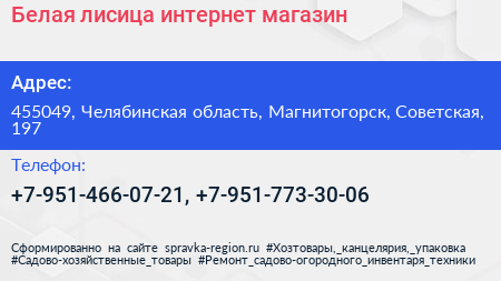 Белая лисица, интернет-магазин по адресу 455049, Челябинская область, Магнитогорск, Советская, 197 в дальнейшем Организация, размещена в следующих категориях: