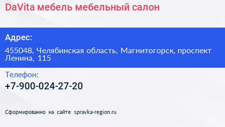 DaVita-мебель, мебельный салон по адресу 455048, Челябинская область, Магнитогорск, проспект Ленина, 115 в дальнейшем Организация, размещена в следующих категориях:
