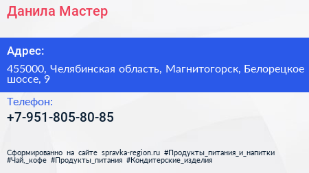 Данила Мастер по адресу 455000, Челябинская область, Магнитогорск, Белорецкое шоссе, 9 в дальнейшем Организация, размещена в следующих категориях: