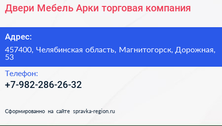 Двери-Мебель-Арки, торговая компания по адресу 457400, Челябинская область, Магнитогорск, Дорожная, 53 в дальнейшем Организация, размещена в следующих категориях: