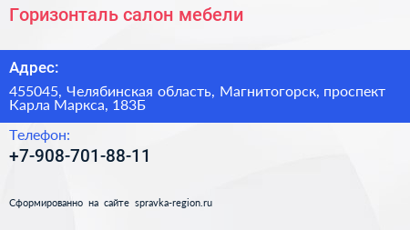 Горизонталь, салон мебели по адресу 455045, Челябинская область, Магнитогорск, проспект Карла Маркса, 183Б в дальнейшем Организация, размещена в следующих категориях: