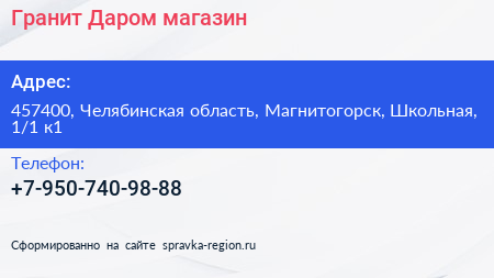 Гранит Даром, магазин по адресу 457400, Челябинская область, Магнитогорск, Школьная, 1/1 к1 в дальнейшем Организация, размещена в следующих категориях: