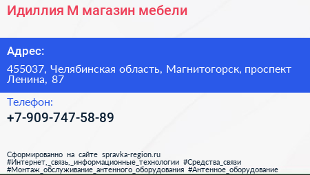 Идиллия-М, магазин мебели по адресу 455037, Челябинская область, Магнитогорск, проспект Ленина, 87 в дальнейшем Организация, размещена в следующих категориях: