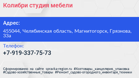 Колибри, студия мебели по адресу 455044, Челябинская область, Магнитогорск, Грязнова, 33а в дальнейшем Организация, размещена в следующих категориях: