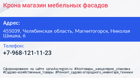 Крона, магазин мебельных фасадов по адресу 455039, Челябинская область, Магнитогорск, Николая Шишка, 6 в дальнейшем Организация, размещена в следующих категориях: