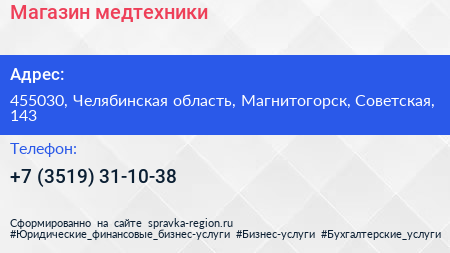 Магазин медтехники по адресу 455030, Челябинская область, Магнитогорск, Советская, 143 в дальнейшем Организация, размещена в следующих категориях: