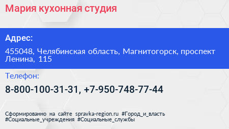 Мария, кухонная студия по адресу 455048, Челябинская область, Магнитогорск, проспект Ленина, 115 в дальнейшем Организация, размещена в следующих категориях: