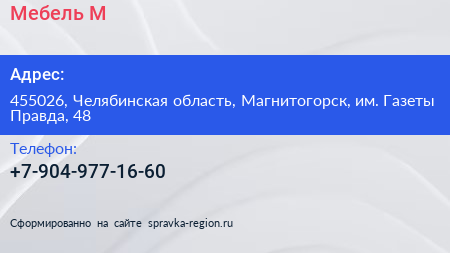 Мебель-М по адресу 455026, Челябинская область, Магнитогорск, им. Газеты Правда, 48 в дальнейшем Организация, размещена в следующих категориях: