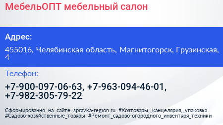 МебельОПТ, мебельный салон по адресу 455016, Челябинская область, Магнитогорск, Грузинская, 4 в дальнейшем Организация, размещена в следующих категориях: